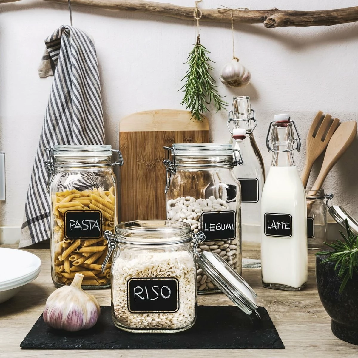 With an airtight hinged lid, the Bormioli Rocco Swing Bottle with Chalkboard Labels is suitable for storing just about anything. This swing bottle features a chalkboard area so you can quickly label contents and then easily change it as you like. Proudly use the glass swing bottle as aĀ counter topĀ canister to display your dry baking and cooking supplies.