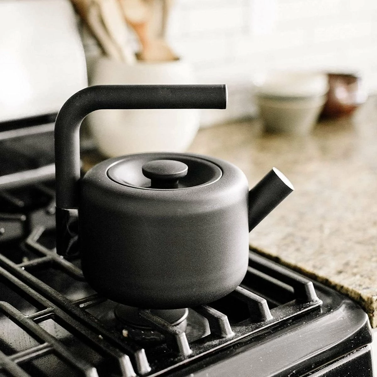 Designed to be a kitchen workhorse with a modern flair for style, the Clyde Stove Top Tea Kettle (Matte Black) from Fellow features a 1.7L capacity and a harmonic two-tone whistle that gives a contemporary twist on traditional kettle design. The kettle is constructed from 18/8 stainless steel and Clyde’s durable matte black finish partners with the simple handle form to showcase a modern aesthetic. While not induction-safe, the kettle is compatible with gas and electric cooktops for a wide range of versatility. Soft silicone on the handle provides a comfortable grip when pouring or filling.