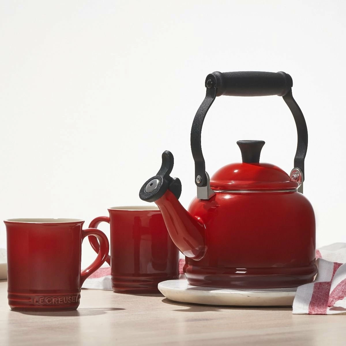 This teapot has a lot of spunk and style and with many vibrant colors to choose from you are sure to find the prefect teapot to tip over and pour out. Strong and durable porcelain enameled steel will last for years. 1.25 quart capacity is perfect to make tea or coffee for up to 4 people. With a single whistle the Le Creuset tea pot will let you know when its ready to go without shouting. Enjoy a piping hot cup with help from your favorite little teapot in cheery Cherry Red!