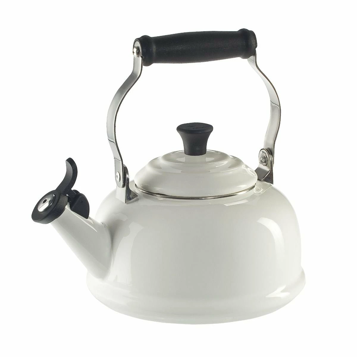 The generous base size of this water kettle provides greater contact with the heating element so water boils quickly with superior heat distribution. The fixed whistle can be easily flipped open while pouring while the heat-resistant ergonomic handle ensures safe pouring. Tackle any hot water need with ease by having instant access to the kettle capacity marked on the base for quick and easy reference. From hot drinks like hot cocoa to hot meals like ramen, this lovely White Classic 1.8 Quart Whistling Kettle by Le Creuset will be a great stovetop companion!