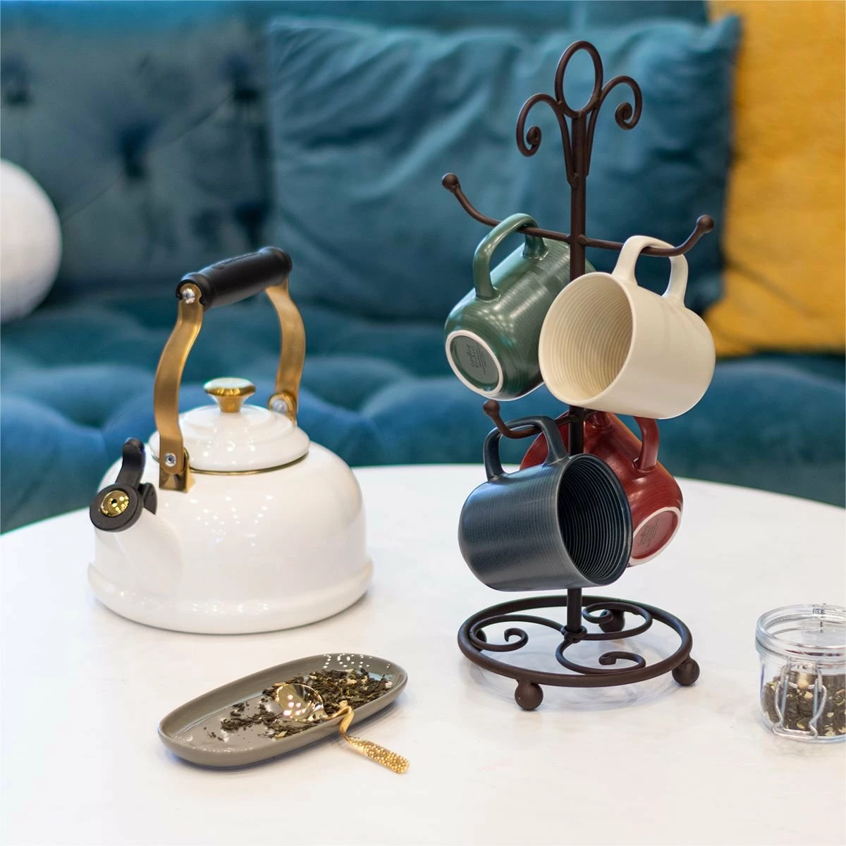 This kettle features a single-tone whistle alert when water has reached a rolling boil so you’ll know, even amid the chatter of family gatherings, when your hot water is ready to pour. The generous base size of this water kettle provides greater contact with the heating element so water boils quickly with superior heat distribution. The fixed whistle can be easily flipped open while pouring while the heat-resistant ergonomic handle ensures safe pouring. Coated in Le Creuset’s crisp White enamel glaze and detailed with luxe gold details, this kettle will pair perfectly with other Le Creuset Noel Collection pieces and blend beautifully in with a variety of kitchen aesthetics when festivities come to a close for the season. Let your kitchen decor capture your festive joy by welcoming the Le Creuset Noel Collection 1.7 Qt. Whistling Kettle in White & Gold into your holiday celebrations.