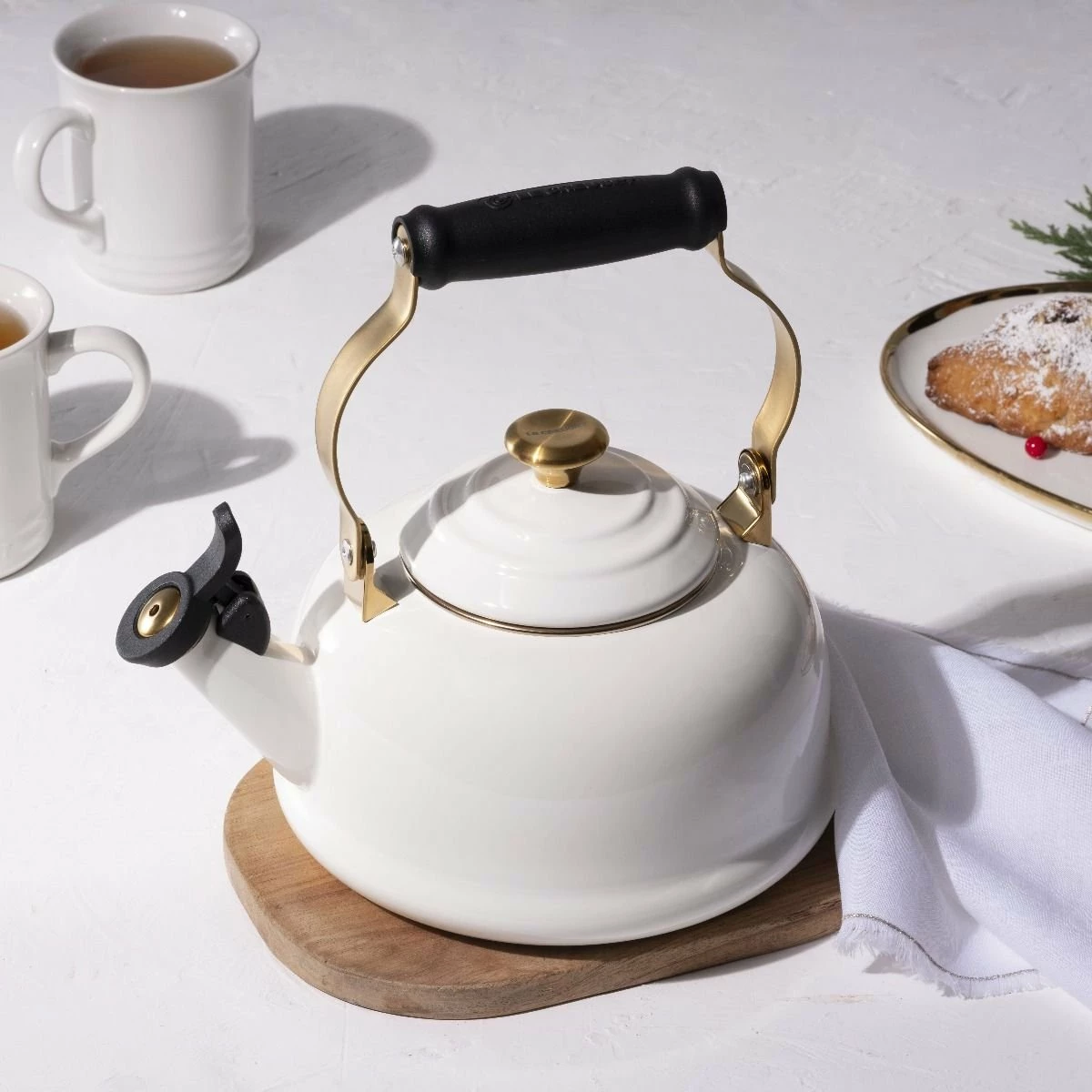 Le Creuset 1.7 Qt. Whistling Kettle – Noel (White & Gold) Features:
