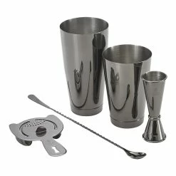 With four basic tools perfect for mixing any classic or creative cocktail, you’ll be able to perfect your mixology abilities in no time! This start-up set contains a Spring Bar Strainer, Bar Spoon, 2-Piece Cocktail Shaker, and a 2 oz. Jigger, all in a sophisticated Gun Metal Black finish.