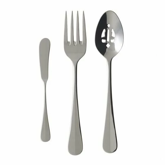 Crafted in 18/10 stainless steel, the La Coupole Hostess set by Villeroy & Boch is sure to maintain its luster and brightness for years to come. The La Coupole Hostess Set will be a perfect addition to your 40-Piece La Coupole Flatware Set, though this one comes with a butter spreader, meat fork, and pierced serving spoon. These pieces feature a ridge upon the top surface of the handle that creates a simple yet refined design with an ergonomic grip. Bring light and beauty to the most formal of gatherings in your home with the Villeroy & Boch La Coupole Hostess Set!